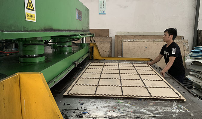 Next comes the cutting step. In order to cut all the mats with clean sides with no trimmings left, we will only put one layer of the sheet instead of putting 3 layers of sheets like others, into our 60T cutting machine. But with a totally 4pcs of 60T cutting machines, we could have good efficiency every day.